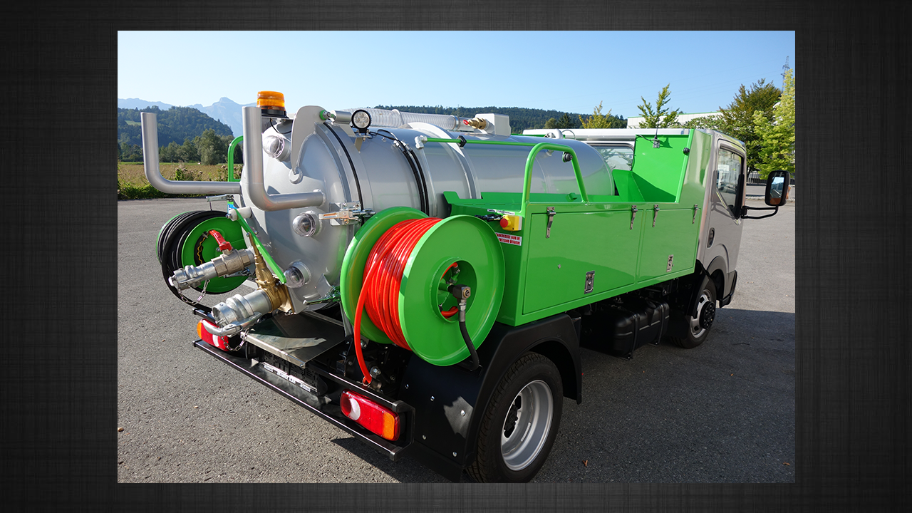 - Schlauchtrommel hydraulisch angetrieben mit ca. 60 Meter HD-Schlauch DN 13, seitlich montierte Füllschlauchtrommel mit 40 Meter Flüllschlauch DN 19, händische Bedienung und Schlauchablage für 40 Meter Saugschlauch DN 60